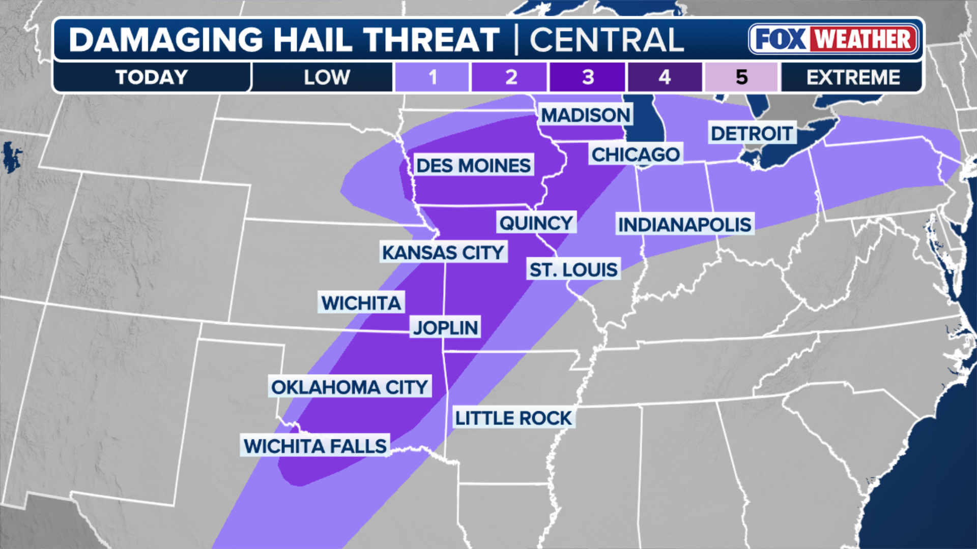 Wednesday's menace has shifted somewhat east, but a wide Level 2 retired of 5 hazard of terrible thunderstorms covers a corridor including parts of North Texas, the Southern Plains, the Midwest and the Ohio Valley, according to NOAA's Storm Prediction Center (SPC).